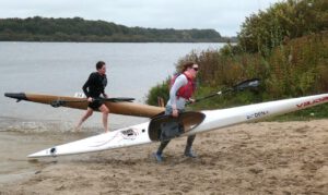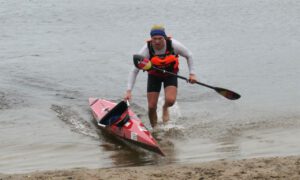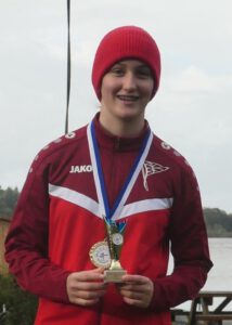 Die Wettkampfdistanz für die Jüngsten (Schüler B = Jahrgang 2013 und jünger) betrug also genau eine Runde auf dem bis zu vier Metern tiefen See, allerdings noch ohne Portage. Besonders schwierig war dabei die obere Wende, weil die hohen Wellen genau seitlich kamen. Trotz Spritzdecke bekamen viele Teilnehmer hier Wassers ins Boot. Bei den Schülerinnen im Jahrgang 2013 gewann Martha Jessen den Kajakeiner. Jona Schiebel kam kurz vor seiner Vereinskameradin ins Ziel und siegte mit deutlichem Vorsprung bei den Jungs in diesem Jahrgang.
