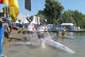 Schon 2015 waren Sven und Marcel in Györ dabei: Sven startete damals zusammen mit seinem Zweierpartner Martin Schubert bei den Junioren, Marcel und Felix Richter (beide zu der Zeit in der U23) starteten im Kajakzweier der Herren Leistungsklasse. 2025 nehmen die Brüder gemeinsam schon zum sechsten Mal bei einer Weltmeisterschaft im Herrenzweier teil und hatten sich mit dem neuen leichteren Boot einiges vorgenommen. Der Start der 26 Kajakzweier war ein beeindruckender Anblick. Der Plan von Sven und Marcel, sich möglichst aus dem größten Kabbelwasser am
